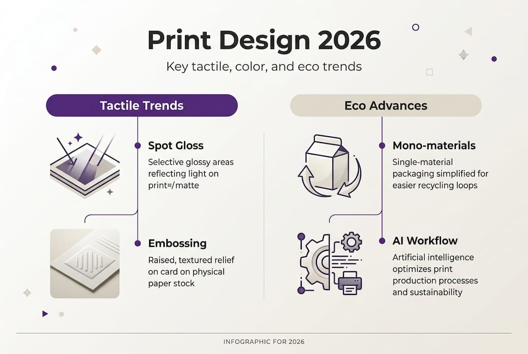 Ultra-thick stocks, spot gloss, and embossing lead 2026 tactile trends by adding physical dimension that engages touch and sight simultaneously. These finishes create emotional connections and premium perceptions that flat printing cannot achieve. They require careful technical execution including CMYK calibration and physical prototyping to ensure quality results.